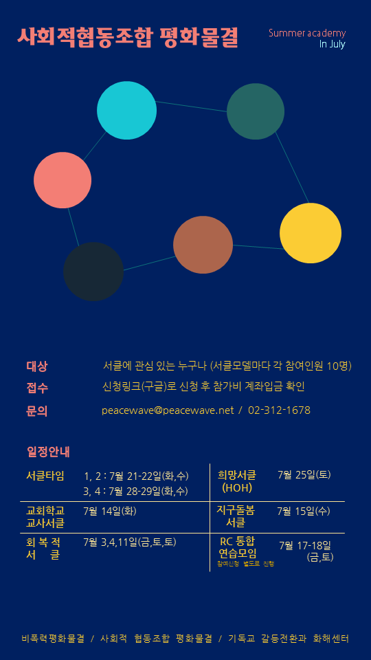 우리가 소중히 여기는 가치를 실현시키기 위해 무엇이든 해보자는 마음으로 다음의 제안을 해 봅니다. '이제는 무엇이라도 할수 있는 것을 해보자!'라는 취지에서 공동체를 위해 무엇인가를 해보고자 하는 열망을 가진 모두가 서클로 함께 모여보기를 초대합니다.