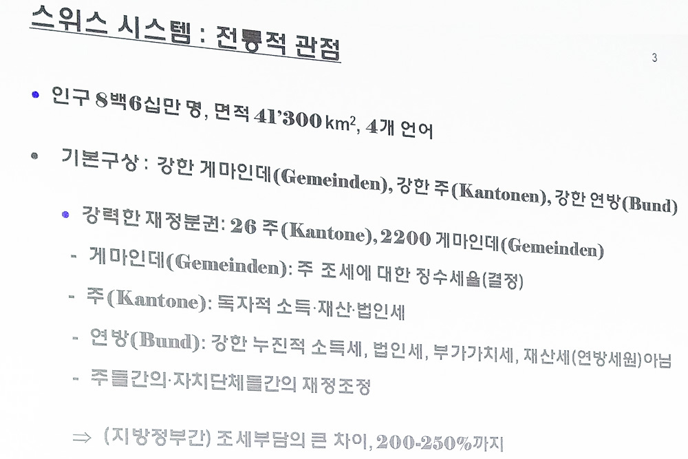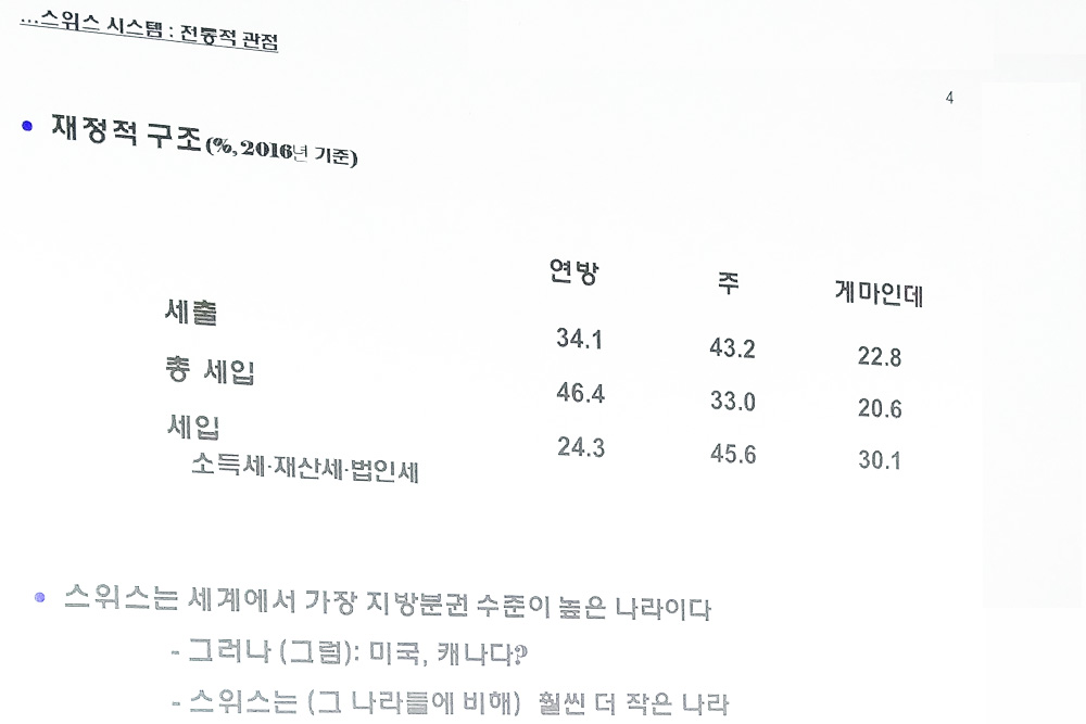 스위스는 한국에 비해 지자체의 재정 차이가 적다. 26개 주 중 2개 주가 가장 못 사는데 잘 사는 주가 못 사는 주를 도와주는 제도가 있다. 도와주는 조건으로 조세정책을 열심히 실시했는가와 기업 유치를 위해 노력하는 데 최선을 다했는지 해명되어야 한다.